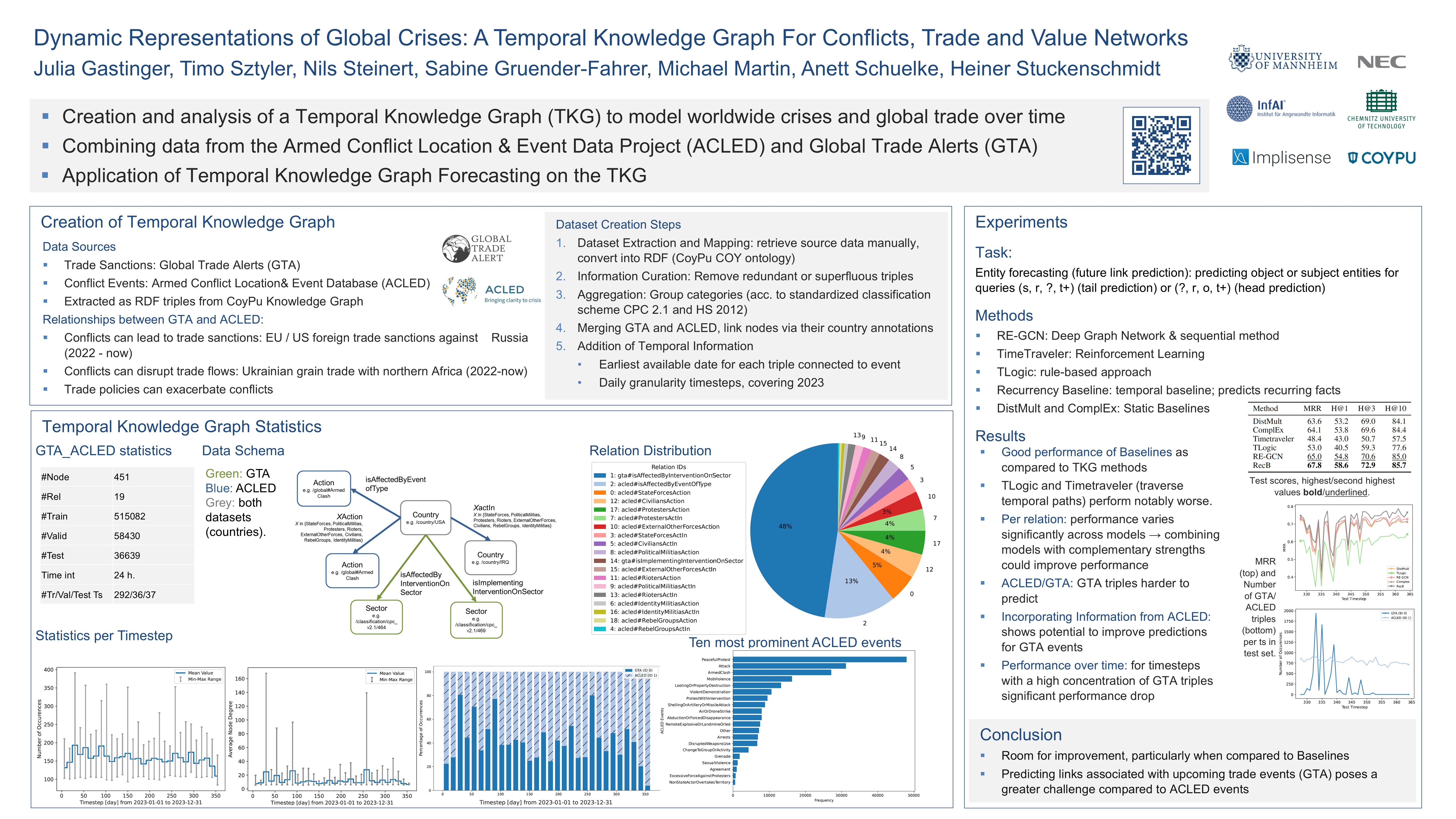 Julia Gastinger, Timo Sztyler, Nils Steinert, Sabine Gruender-Fahrer, Michael Martin, Anett Schuelke, Heiner Stuckenschmidt Dynamic Representations of Global Crises: A Temporal Knowledge Graph For Conflicts, Trade and Value Networks. In Learning on Graphs Conference (LoG), Virtual Event, 2024.
